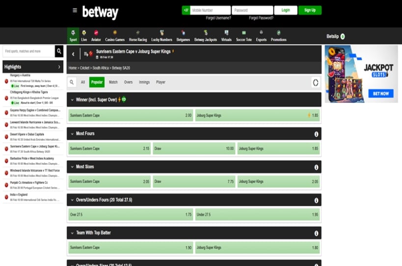 Players can log in and head to the Betway SA20 pre-match markets. For the upcoming SA20 game between Eastern Cape v Joburg Super Kings, Betway has increased the odds of an away win to 1.85.