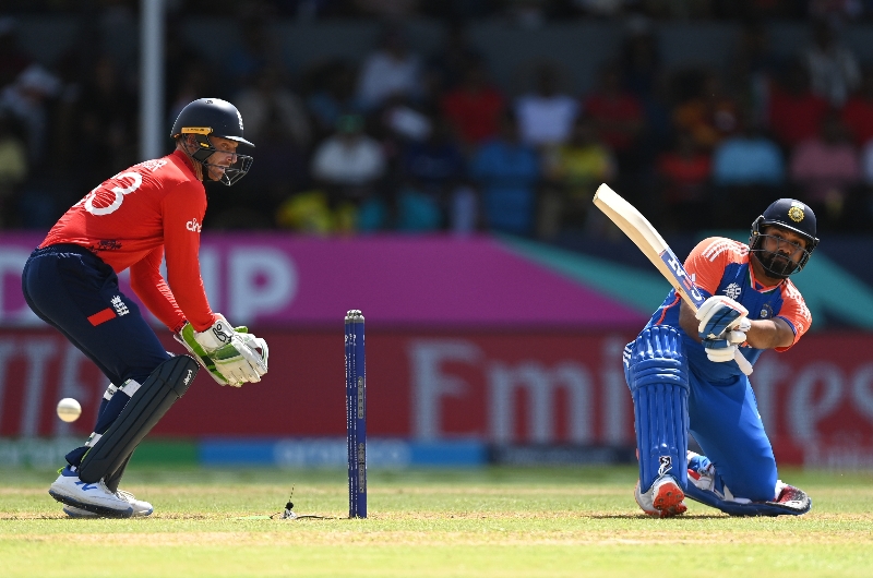 Rohit Sharma reverse-sweeps against England.