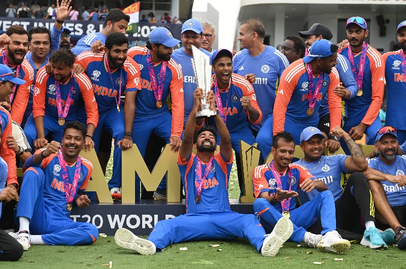 Mohammed Siraj of India lifts the trophy after the ICC Men's T20 Cricket World Cup (Getty Images)