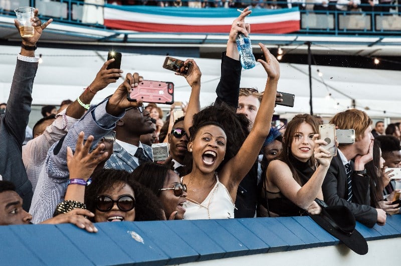 People cheer during the main race of the 2018 edition of the Vodacom Durban July. (Getty)