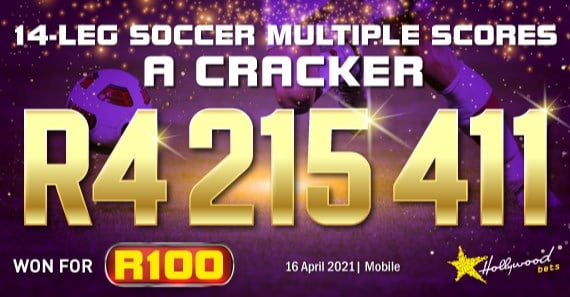 The punter placed the bet at Hollywoodbets, staking R100 and successfully navigated his way through a 14-leg multiple.