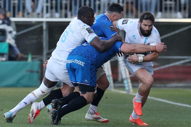 Joseph Marchant, Paul Abadie, and Thibaut Dibongue dotted down over the try line against Bayonne.