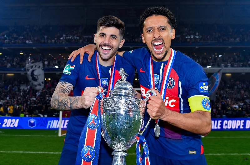 Lucas Beraldo of PSG and Marquinhos of PSG with the French Cup Trophy following the French Cup Final match (Getty Images)