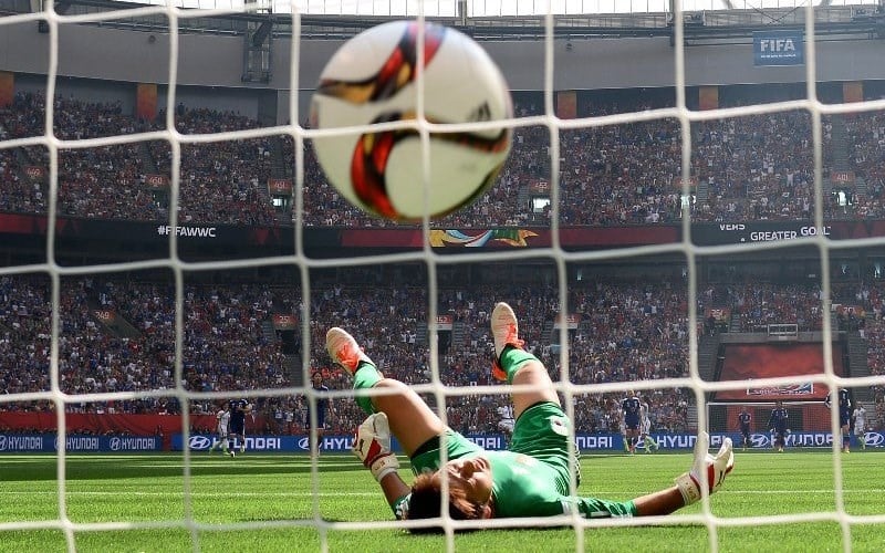 VANCOUVER, BC - JULY 05: Goalkeeper Ayumi Kaihori #18 of Japan reacts after she is unable to save a goal by Carli Lloyd #10 of the United States as Lloyd scores her third goal in the first half in the FIFA Women's World Cup Canada 2015 Final at BC Place Stadium on July 5, 2015 in Vancouver, Canada. (Photo by Dennis Grombkowski/Getty Images)